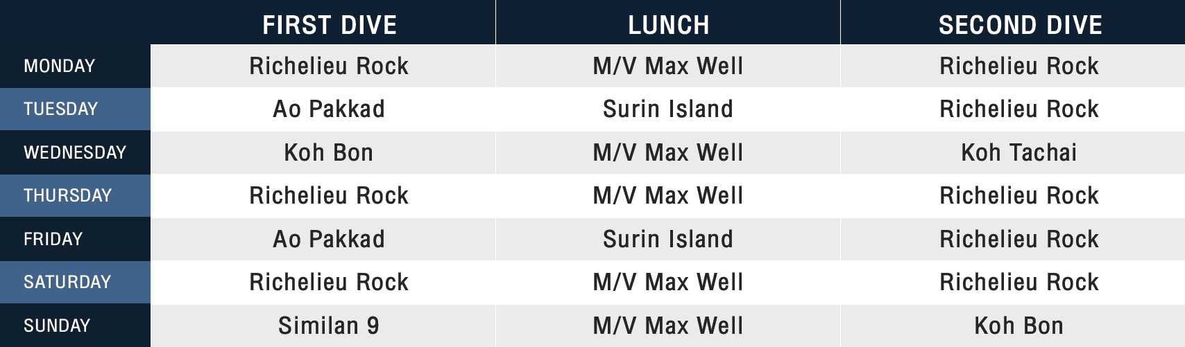 Our updated weekly schedule allows you to see the best these marine parks have to offer. From 8 dives a week at the world-famous Richelieu Rock and 2 dives at Koh Bon, our spacious and comfortable Maxwell is the perfect way to get there.
